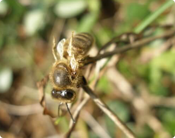 Deberíamos revisar unas 10 colmenas por asentamientos (sea el tamaño del colmenar el que sea, idealmente un 25% del apiario), 5 de ellas en la zona de la primera fila por donde entran las abejas, y las otras 5 de las que vemos en piquera con síntomas sospechosos: presencia de abejas con el virus de las alas dañadas (Foto 8), pupas expulsadas (Foto 9), incluso la presencia de algunas varroas muertas enfrente de la piquera o en los bordes de esta.